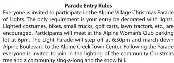 Immediately following the parade, Santa and his helpers will help light the Alpine Community Christmas Tree at the Alpine Creek Town Center, 1347 Tavern Road. Join a holiday sing-a-long, and stay for the free snow hill sledding.