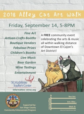 September 5, 2025 (El Cajon) -- Local artists and galleries are coming together to host the 14th Annual Alley Cat Art Walk on Friday, September 12th from 4pm to 8pm in Downtown El Cajon. This free, family-friendly event promises fine art, live entertainment, boutique vendors, and more along Main Street and Rea Avenue.