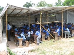 destroyed by the quake. Now 800 children attend class under tarps propped up by bamboo sticks--and miss many days due to rains.