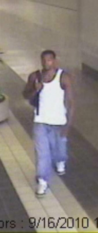 September 19, 2010 (El Cajon) – A woman was robbed in the east parking structure at Parkway Plaza shopping mall on Thursday, September 16 at 11:47 a.m. by a man who also tried to carjack her vehicle. El Cajon police have released a security photo of the suspect, an African-American man, 18-25 with a muscular build and a tattoo on his neck.