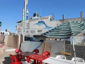Our server came out immediately and asked our pleasure. A round of beer was ordered all around while we perused the menu. Prices ranged from $2.50 for a large white clam made to order with cheese (gratinos), or done up in garlic and tomatoes with chilies. I ordered the brown clam which is a bit bigger and cost $3. Wrapped in foil and broiled until the cheese melted and the clam was done to perfection, this was my choice of an appetizer. The most expensive items on the menu included oysters on the half shell, a dozen for $11 or lobster which was $12. One of us ordered the seafood soup, overflowing with seafood like fish, octopus, shrimp, and crab legs poking out the top. Another got the breaded shrimp dinner. I completed my meal with fish done up in lots of garlic, a common specialty in the Baja. Not a bone was present in the filet which covered half the plate, and again the fish was done to perfection. Rice and beans and small salad accompanied my fish for $8. the ever present tortillas in a little warmer accompanied our food. My friend to the right ordered garlic shrimp which covered half of her plate with medium shrimp for $9. Everyone was completely satisfied with their food.