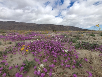 March 16, 2024 (Borrego Springs) – Those heavy winter rains have resulted in one of the most beautiful bloom seasons in recent memory in the Anza-Borrego Desert. I visited earlier this month, finding the desert floor along Henderson Canyon Road bursting with colorful purple verbena, white primroses and yellow sunflowers.