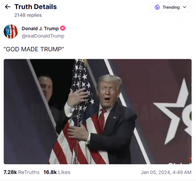Trump meanwhile posted a video on his social media platform that proclaimed “God created Trump” to be a “shepherd to mankind” who would be “willing to go into the den of vipers, call out the fake news for their tongues as sharp as the serpents” as well as “wrestle the deep state” and “wield a sword.”