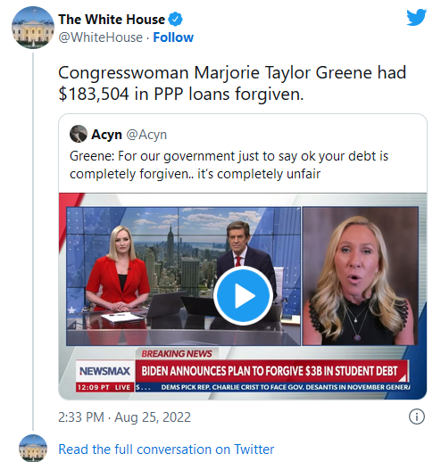 The White House revealed Greene’s hypocrisy, since she had $183,504 in federal PPP loans forgiven.
