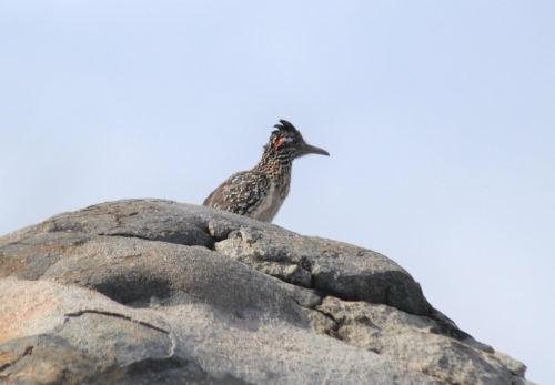 The roadrunner is a fast and an accurate hunter. They’ll eat just about anything they can catch. Insects, rodents, small birds, lizards and snakes. I believe their favorite food are lizards and snakes, even rattlesnakes. This is the time of year when reptiles emerge from their cold sleep and the roadrunners are happy to see the food source. When a rattlesnake is caught, the roadrunner will thrash the snake on a rock while holding it in its beak until the snake is not moving anymore and then will swallow it whole.The roadrunner is a member of the cuckoo family. The Latin name means “California earth-cuckoo.” It’s found in the Southwestern United States and Mexico, and most likely crosses the U.S. – Mexican border undetected by Border Patrol! It’s the fastest land bird that can fly. The roadrunner’s life span is about 7-8 years. It’s the state bird of New Mexico. The roadrunner is definatly part of our social consciousness mainly because of the Looney Tunes of the 60’s. Beep-beep!