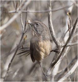 The Wrentits is a fascinating bird. In the scientific classification of birds it stands as one in its own Genus. It's common name and its external resemblance is close in looks to Wren's and Bushtits but is not closely related to either one. The bird’s face looks just like a Bushtit face. Bushtits hang out in large groups and mating pairs can s