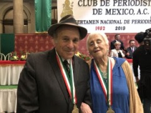 Daniel Estulin introduces Greg Palast at the Association of Mexican Journalists ceremony in Mexico City on June 7, 2019, as Palast was awarded the prize for International Journalist. See attached photo of Palast