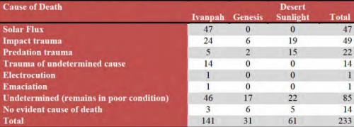 Ivanpah proved by far the deadliest; 141 of the total 233 bird deaths found were at Ivanpah. Only Ivanpah caused death by solar flux (47) due to its unique technology. Desert Sunlight also had a high number of bird deaths (61), mostly from impact trauma and predation – troubling since photovoltaic technology is common. Genesis had 31 bird deaths at its facility, most from undetermined causes.