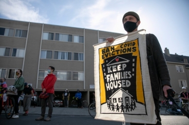 Photo, right: Oakland resident Andrew Rosenburg holds up a banner while protesting rent evictions during the pandemic on Dec. 5, 2020 in Oakland. Photo by Anne Wernikoff, CalMatters