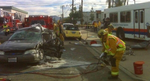 Arriving emergency crews from had to use the jaws-of-life to extricate the seriously injured driver from his vehicle. He was then transported to Sharp Memorial Hospital’s trauma center. Two people on board the transit bus were transported with injuries, including one in serious condition.