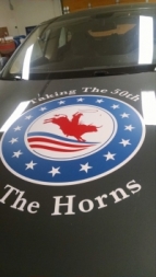 His slogan, “country before party,” is emblazoned on the front of his sustainable vehicle, which also has a bullrider logo and the phrase “taking the 50th by the horns” emblazoned on its hood. The latter is a nod to Beauregard’s past
