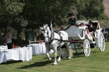 Linda started out offering horse-drawn carriage rides countywide, including at weddings, before starting up weddings at her horse training ranch with her husband, Larry, in 2000. The facility can accommodate parking for up to 350 guests onsite, or 400 guests if limo busses are provided.