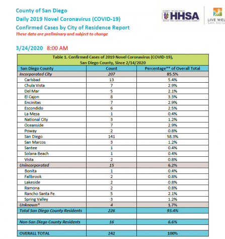 March 24, 2020 (San Diego) – The number of COVID-19 cases in our region continues to grow at a steep pace.  San Diego County now has 242 confirmed cases, of whom 226 are county residents. Two of the new cases are in infants. Heath experts warn the actual number of cases could be ten times higher, since not enough tests are available and thus testing is being done primarily on those hospitalized with respiratory distress.