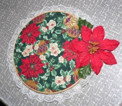 Purchase fabric with a holiday pattern at any fabric store or discount store with a sewing department. I found this poinsettia-themed fabric and embroidery hoops at JoAnn Fabric & Crafts at Navajo and Fletcher Parkway. I picked up a plain wooden napkin holder at Wal-Mart and an assortment of containers (jars, pots, etc.) at discount stores, though yard sales are also good sources for these inexpensive items.