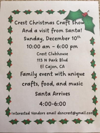 November 12, 2023 (Crest) – Ho ho!  Santa will be visiting at the Crest Christmas Craft  Show on Sunday,  December 10.