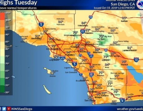 October 19, 2019 (San Diego) – The National Weather Service is warning of critical fire weather from Sunday through Tuesday locally, with the highest risk on Tuesday.