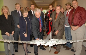 Doing the honors with ceremonial scissors for the ribbon cutting was Grossmont-Cuyamaca Community College District governing board president Bill Garrett. A ribbon of toy paper money was strung together in keeping with the grand-opening theme of the stock exchange. (Front row, from left, are: governing board trustees Mary Kay Rosinski, Deanna Weeks, Greg Barr, Garrett and student trustee Charles Taylor III. Second row, from left: trustee Rick Alexander, college interim president Ron Manzoni; Chancellor Cindy L. Miles; and student trustee Christopher Enders. )