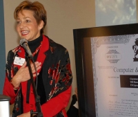 Dr. Cindy L. Miles, chancellor of the Grossmont-Cuyamaca Community College District, thanked the many people who made the construction of the $28 million building possible. Shown on the monitor behind her is a mock stock certificate, part of the event’s theme of an initial public offering on the “Cuyamaca Stock Exchange.”