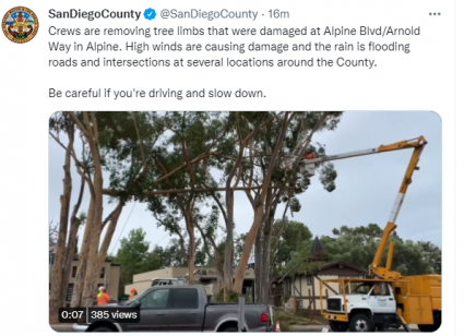 These damaging winds have also caused numerous power outages in East County and San Diego’s inland region, including Blossom Valley, El Monte Valley, Japatul Valley, Buckman Springs, Morena Village, Jamul, Lyons Valley, Rincon, Barona, Ramona, Iron Mountain, Palomar Mountain, and Lake Henshaw. For updates on outages and estimated restoration times, visit https://www.sdge.com/residential/customer-service/outage-center/outage-map.