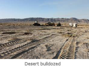 Prior to construction, the desert had a thick layer of vegetation, lush in places, including century-old Ocotillos and Chollas cacti, along with many other species. The desert floor was bulldozed and massive excavations were dug to support wind turbines and high voltage towers, stripping off topsoil and laying bare the earth.