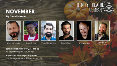 The Trinity Theatre Company of San Diego presents the digital livestream of "November," by David Mamet. Although the theme touches on current situations, it brings us the humor, lightness and whimsy we need. to be able to laugh and escape for a couple hours. The show has strong language, and runs about two hours, with a five minute intermission which we do need when watching these longer zoom sessions.