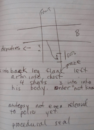 Sheriff’s Deputy Russell fired four shots at the fleeing suspect. According to a diagram provided to Bils’ mother by San Diego Police, one bullet struck her son in the back, another in his leg, a third in his arm and chest, and a fourth grazed his flank.