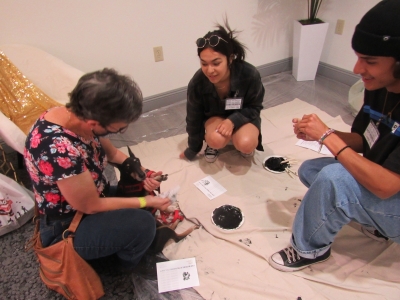 Many dogs seemed a little wary of getting the bottoms of their paws inked by volunteers and then stepping on a card on the ground to make take-home pawprints, but snacks offered to the dogs helped smooth the process.
