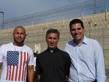 Aamer Moshi (photo, right, with Father Noel and Mark Arabo) told ECM that he has “a couple of cousins and friends I know from back home” who are in the detention facility, some held for up to seven months. He goes to visit them every weekend, he says, adding that they are receiving adequate food and have access to essentials such as showers “but it is still a prison.”