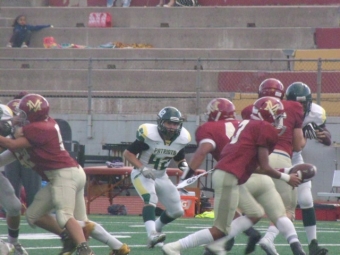 The senior back wasted no time at all. A minute into the first quarter, McClendon charged all the way downfield for his first rushing touchdown of the game to put Monte Vista up front. A few minutes later, senior quarterback Kenny Stevens threw it all the way downfield to senior tight end Blake Schmidt for another Monarchs touchdown to go up by two scores, 14-0, after one.