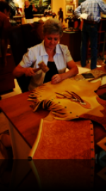 The Alley Cat Summer Festival also included showings of artwork at other local galleries throughout downtown El Cajon. Artist Marty Barnard (photo by Joel Ryerson) demonstrated her crafting of custom leather pieces at Silver Creek Fine Art & Framing. She got started 20 years ago, when she had a custom saddle made. Barnard had a passion for drawing so she started studying leather work under John Bianchi, who is well known for his leather work.