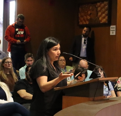 Julia Gomez (right), interim managing director of the ACLU of San Diego and Imperial counties, said her group had sent a letter to the City Council urging a no vote on the resolution on antisemitism.