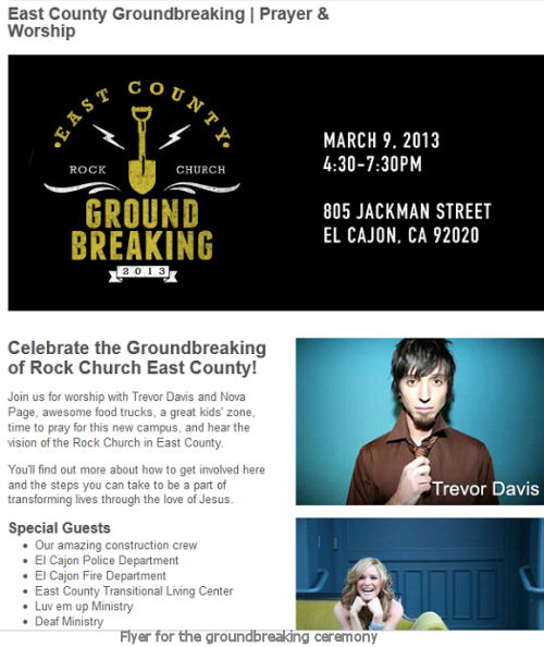 February 26, 2013 (El Cajon)--The City of El Cajon may once again be walking down a rocky road of church and state separation issues with the announced participation of the El Cajon Police and Fire Departments as “special guests” at the groundbreaking of Rock Church’s newest location on Saturday, March 9 near Parkway Plaza on Jackman street. The invitation also includes “prayer and worship” at the newly-leased space.