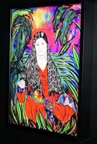 Right now, there are two exhibits. The first one is by the LA based artist, Carolyn Castano, a child of Colombian immigrants. Her colorful exhibit, called Mujeres Que Crean/Women Who Create, honors the life stories and resilience of a group of Colombian women who were forced to leave their homes due to social and political upheavals. They relocated to Medellin where Castanos worked with them. She displays their stories and her artistic vision using a variety of media.