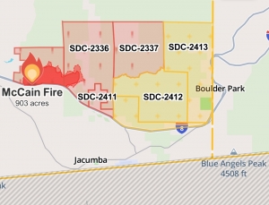 fire has potential for 1,500 acres and is currently 903 acres with zero percent containment.; winds have shifted and are blowing northeast. The first is burning east of Tule Lake, north of I-8, and west of DeAnza Springs Resort. It is currently burning parallel to I-8. All of DeAnza Springs Resort has been ordered to evacuate. More evacuation orders and warnings are being prepared for parts of Jacumba as far east as Boulder Park/Desert View Tower, though the downtown Jacumba area is not currently threatened, nor is Pine Valley. Winds could shift however, so be vigilant tonight if near this fire. The #McCainFire was caused by a vehicle fire with an injury, however no firefighters or civilians have been injured by the fire and thus far, no structures have been lost.Over150 firefighters are at the scene. A smoke advisory has been issues for areas east of Boulevard.