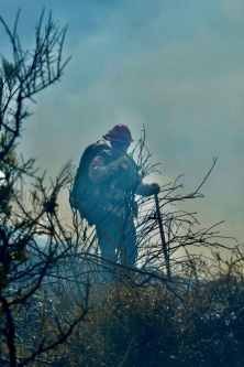 As air support continued to surround the fire with retardant and water drops, hand crews worked the steep terrain to successfully keep the fire from spreading down a gully to nearby houses.