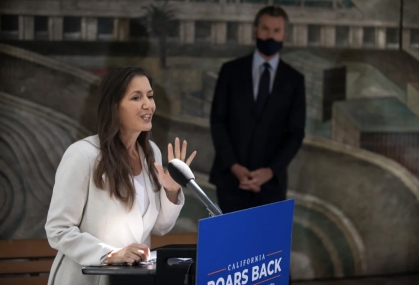 Photo:  Oakland Mayor Libby Schaaf speaks during a press conference with Gov. Gavin Newsom at The Unity Council in Oakland to announce additional rent relief on May 10, 2021. Photo by Anne Wernikoff, CalMatters