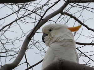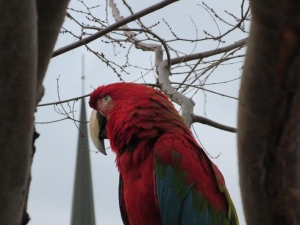 January 16, 2015 (El Cajon)--On Monday morning, I was out for my daily morning walk. It was cloudy, cool, and a little gloomy. I was zoned out listening to some music on my iPod Touch, yet as always, keeping an eye out for a photo opportunity. Passing by Prescott Promenade Park (229 East Main Street, El Cajon), this writer noticed four birds in a tree which were definitely ‘non native’ to the area. In fact, the birds include parrots, a cockatoo and a macaw.