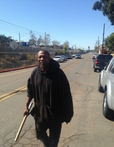 Photo, left: East County Magazine reporter Maridian Broadus with walking stick moments after the police officer asked Mr. Wiley if he was at the rec center
