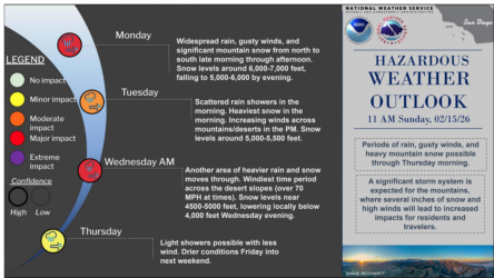 February 16, 2026 (San Diego)—A wind advisory is in effect today across San Diego County through 8 p.m., with another wind advisory tomorrow due to a storm system bringing heavy rains and strong wind gusts up to 45 miles per hour.