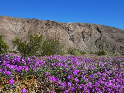 February 16, 2026 (Borrego Springs) – Heavy winter rains have brought an early start to wildflower blooming season in the Anza Borrego Desert. During a trip there on Super Bowl Sunday, I found flower fields abloom with purple verbena on Henderson Canyon Road, as well as some white evening primroses, purple lupine and various yellow blossoms all against a dramatic backdrop of rugged mountains.