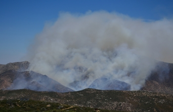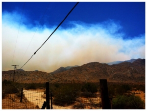 We came down Banner from church about 12:30 evidently fire trucks had all gone past Banner Store and almost to S-2 and then turned around and came back. Bombers were attacking it by the time we got to Shelter Valley. We were in Shelter Valley for a while and the smoke looked like it was getting thicker on S-2 south of us, so we decided to head home in case they might close the road at Oriflame Canyon south of Box Canyon....But there was NO smoke crossing the road once we entered Blair Valley. We could see the smoke back in Rodriques Canyon and Oriflame, and when we got south of Box Canyon we could see it had burned down towards Mason Valley, but it doesn't look like it will come anywhere near Butterfield at this point. Smoke can be seen from our valley behnd the Vallecitos Mtns between us and Blair Valley all the way towards the Southeast. We live in the Vallecitos Valley, south of Mason Valley.