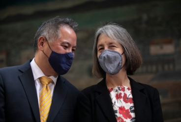 Photo, right: Assembly Budget Committee chairperson Phil Ting, left, talks to Senate Budget Committee chairperson Nancy Skinner during a press conference at The Unity Council in Oakland where Gov. Gavin Newsom announced additional stimulus checks with the state surplus on May 10, 2021. Photo by Anne Wernikoff, CalMatters