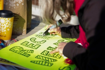 Photo, right: Recall Newsom volunteer Pat Miller makes a sign during a petition signing event at SaveMart in Sacramento on Jan. 5, 2021. Photo by Anne Wernikoff, CalMatters