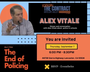 I have just been informed earlier today, that Alex Vitale, of the Police and Social Just Project, Brooklyn College, will break bread with the Lancaster social activist organization; "Cancel the Contract" starting at 6:00PM today. Also, Mr. Vitale will be a guest panelist at the "Demanding Reparations For Los Angeles Sheriff Deputy Gang Violence" at Loyola Law School in Los Angeles on September 8-10, 2023. See attached here.