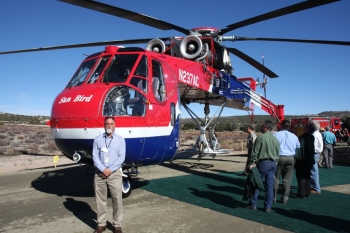 The Sunbird can be converted from its role in Powerlink construction to drop up to 2,500 gallons of water—far more than the 325 gallons that city and county helicopters can currently handle. Randy Lyle, SDG&E helicopter specialist, said the Sunbird can fly at the maximum end of winds 30-35 mph, though like other aircraft it would be grounded in high Santa Ana winds.