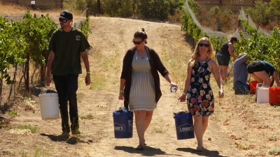 Wine club members and other visitors first got a taste of what it’s like to pick grapes, getting tips on harvesting ripe Pinot Noir grapes on the vines.