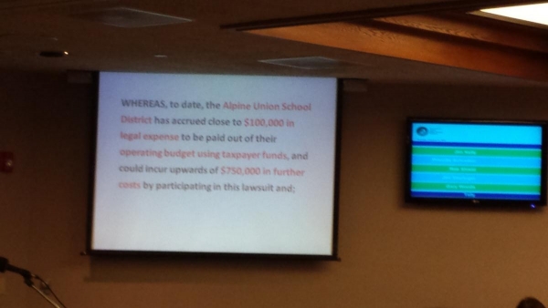 Shield, along with trustees Jim Kelly and Gary Woods, pushed through the resolution which also included a paragraph which which claimed that the Alpine Union School District could be forced into spend up to $750,000 if it chooses pursue the litigation against the GUHSD.