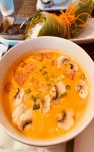 gan and vegetarian dishes. These include fresh tofu wraps with plum ginger sauce, Tom Kha coconut soup, papaya salad, pad Thai, eggplant in garlic-chile sauce, pineapple fried rice, and several types of curries.