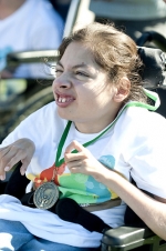 The games were created to showcase the talents of the Helix special education students. Participants with severe intellectual and physical disabilities, many confined to wheelchairs, participated in five athletic field events including the Long-Ball Challenge (throwing a softball for distance), the Soccer Goal Challenge (kicking a soccer ball into a small goal), the Agility Course (a short zig-zag course of cones), the Discus Throw (using a plastic throwing disc) and Bowling (with a hollow bowling ball and plastic pins on artifical turf). There were five teams of four students and the entire presentation lasted just over an hour.