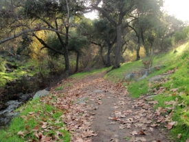 If it's not wet, continue east, up the canyon on the fire road. After strolling beneath the large trees, you will eventually be presented with a clear fork. The left option is the fire road you've been walking on, heading obviously uphill. The route I recommend is the right fork, which is a narrow, rolling single track rising gradually over a deep, beautiful canyon.